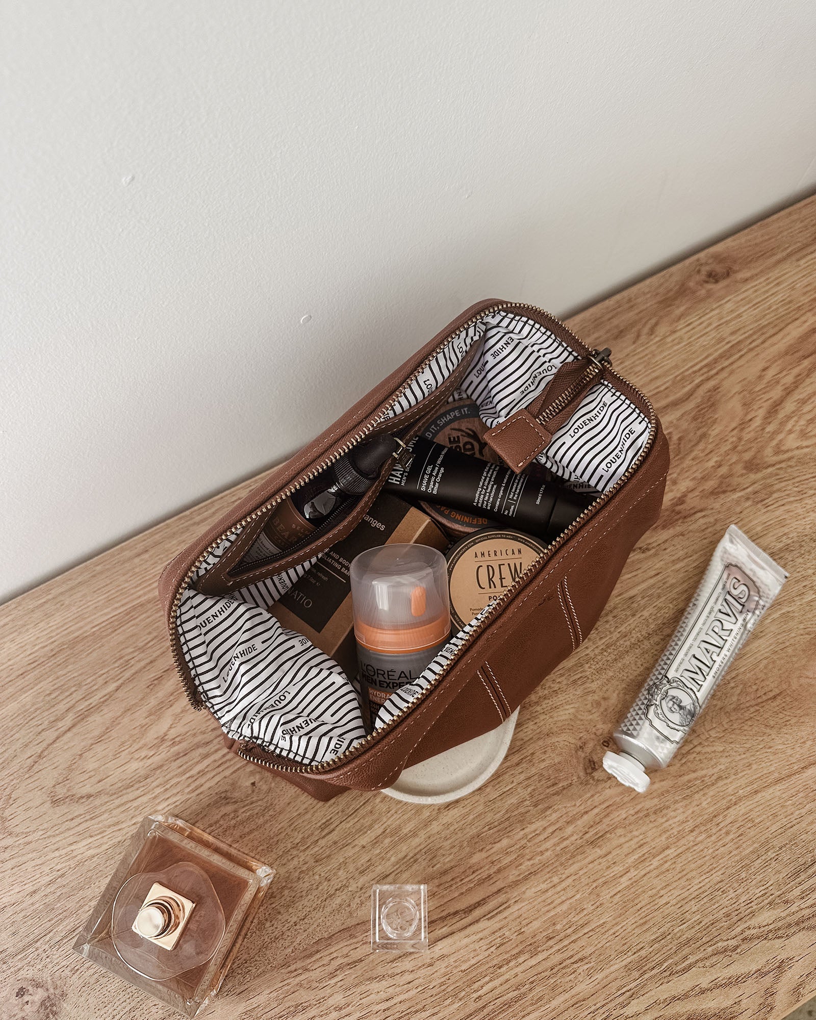 The Albie Saddle Cognac Cosmetic Case is a refined wash bag designed for effortless organisation and everyday practicality. Crafted from smooth vegan leather and finished with antique gold hardware, this cosmetic case offers a sleek, modern look suited to any routine. Inside, a practical zip pocket keeps smaller items neatly contained, while a secure zip closure ensures everything stays in place. With its considered design and durable construction, Albie Saddle Cognac stands confidently among the best toiletry bags for men.