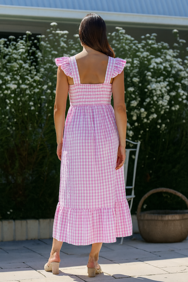 The Yumi Gingham Dress. Designed in a gorgeous pink gingham print, this maxi brings together everything we love about easy summer styling: comfort, colour and a flattering feminine fit.
