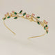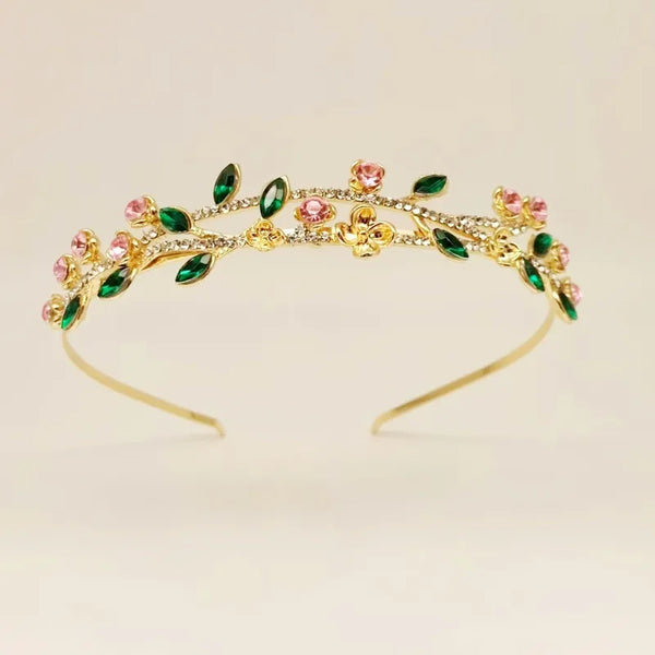 Add a touch of whimsy to your outfit with the Flower Princess Headband, featuring a delicate gold band adorned with shimmering gold flowers and sparkling green and pink gems. Perfect for your next race day.