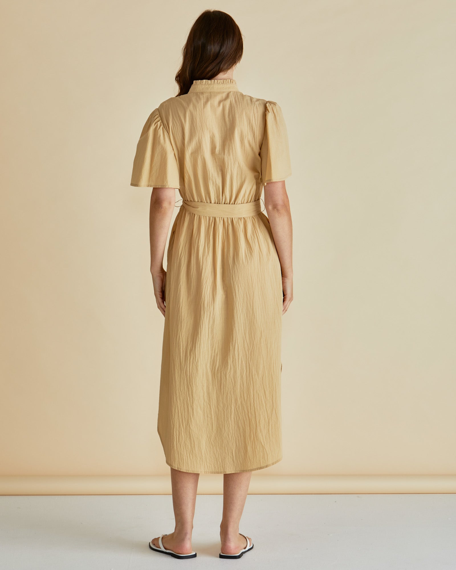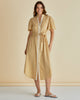 The Immie Dress combines relaxed elegance with timeless appeal. Featuring a stand collar, button-up front and elasticated waistband, it creates a flattering yet comfortable shape. The curved hem and self-fabric waist tie add soft sophistication. An effortless transeasonal piece that feels classic and elevated.