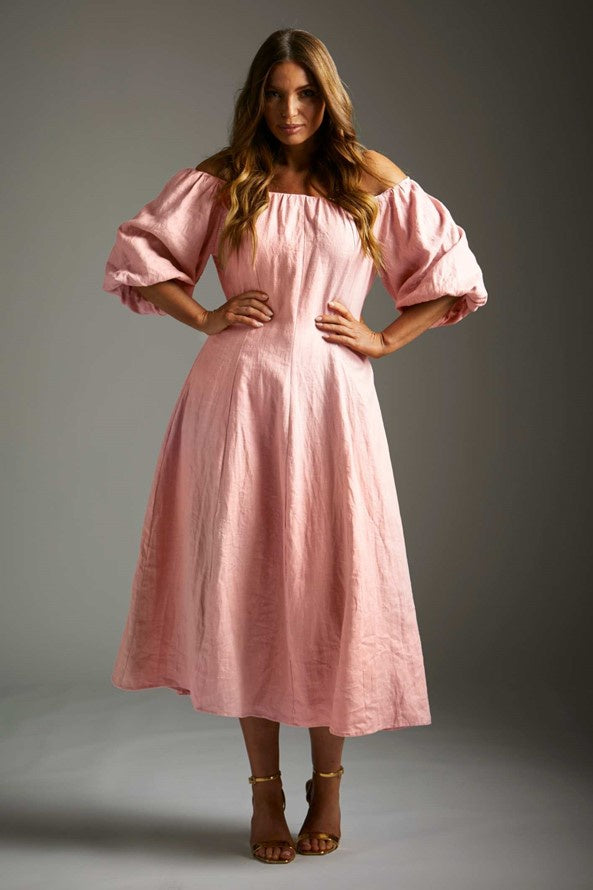 The Grandeur Dress in Blush combines classic elegance with everyday comfort. Crafted from a luxurious cotton linen blend, this timeless piece features a flattering silhouette that works beautifully across seasons.