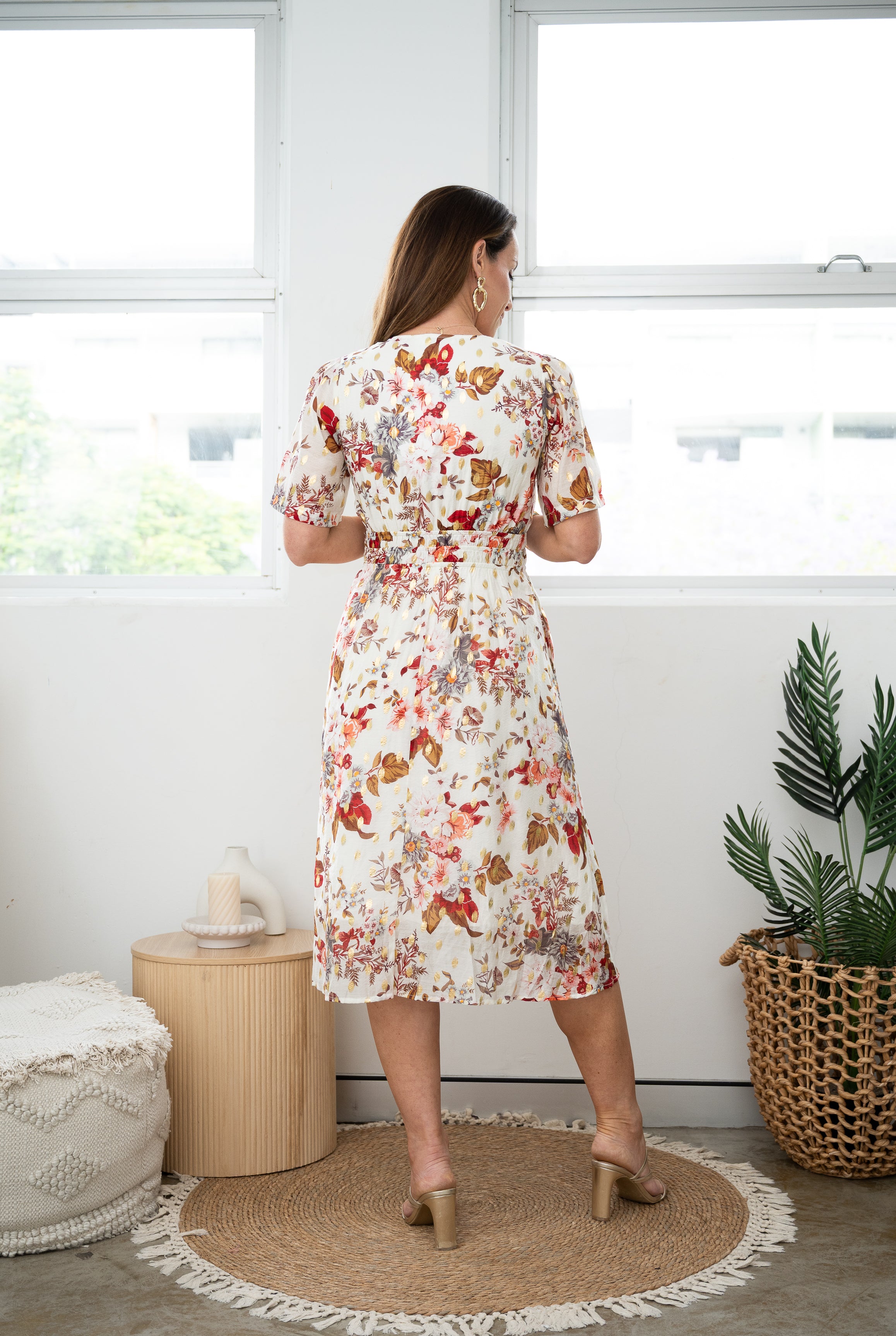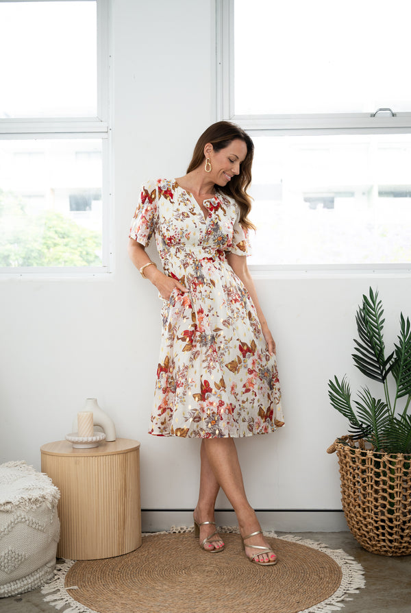 Meet the Hazel Dress, your new festive season favourite. Light, flowy and effortless to wear, this beauty features a striking red print with delicate gold leaf detailing that catches the light with every step.