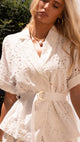 Short sleeves with tab detailing are elevated by statement gold buttons on the cuffs, while the gold button closure and luxe gold belt buckle add a touch of polish. Partially lined through the centre for comfort and coverage, the Holly Blouse strikes the perfect balance between feminine and sophisticated.