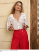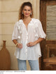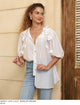 The Kara Flower Blouse in White, a playful piece adorned with beautiful floral details. Its delicate design adds a fresh, feminine touch to any outfit, perfect for days when you want to feel effortlessly charming.