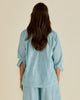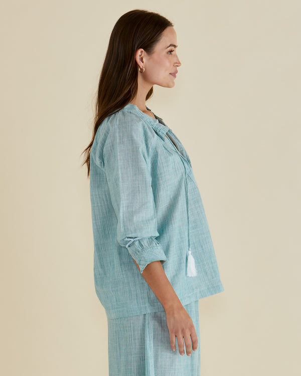 The Charli Blouse combines handwoven cotton with an open V-neckline and tie neck detail for an elevated silhouette. Raglan sleeves and relaxed fit add effortless comfort. A sophisticated and classic piece perfect for transeasonal layering.