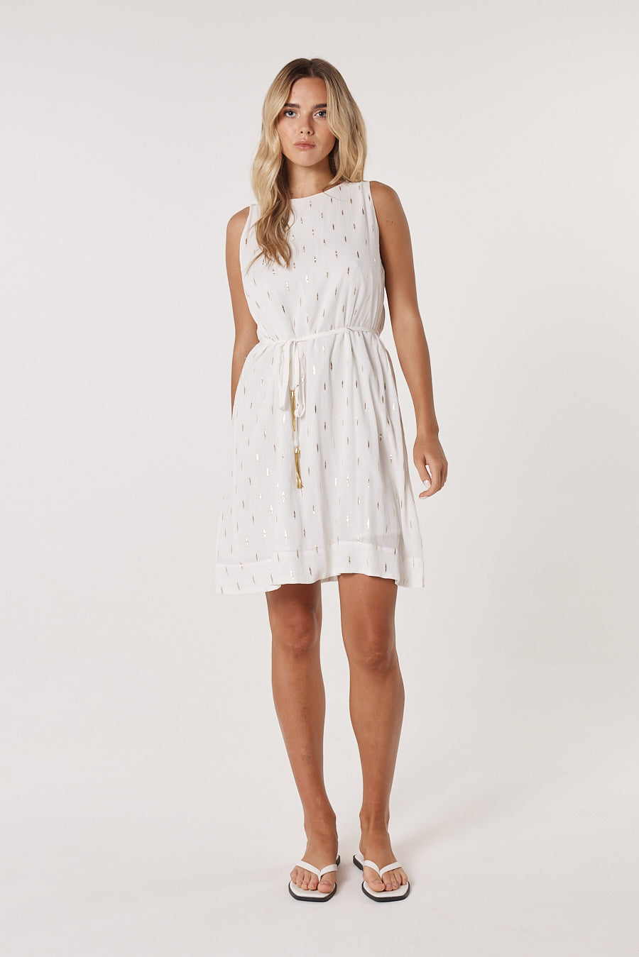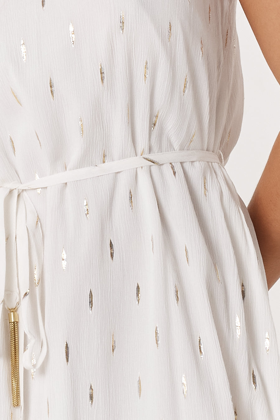 The Delia Shift Dress brings modern allure to a classic mini silhouette. Crafted in a metallic print with a soft boat neckline and detailed tie ends, it shimmers with subtle sophistication. A refined piece designed for effortless statement dressing.