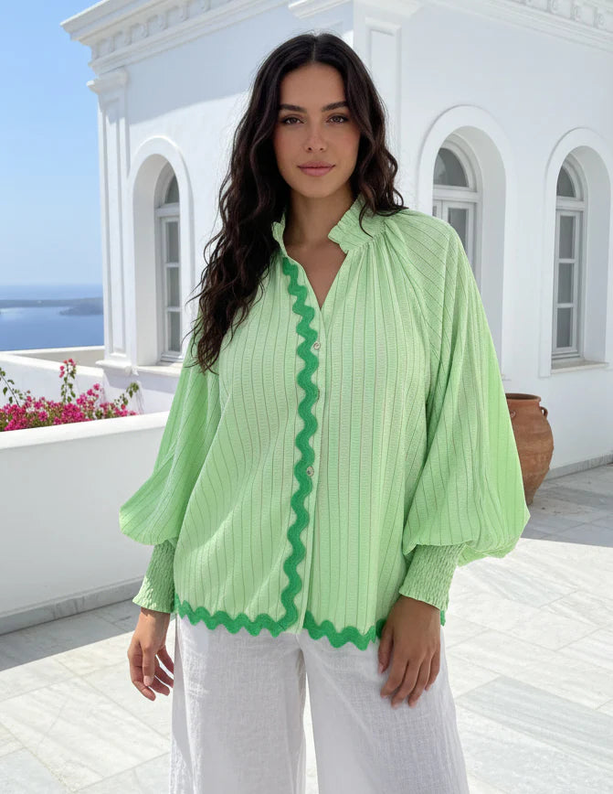 Add a pop of fresh color to your wardrobe with our new Wave Trim Shirt Shirt. Crafted from a soft, breathable cotton blend, this relaxed-fit dress is perfect for effortless everyday style. Featuring a classic shirt collar and signature wavy trim detail down the front and hem, this shirt brings a fresh pop of personality to your everyday look.