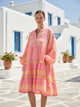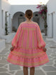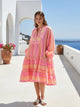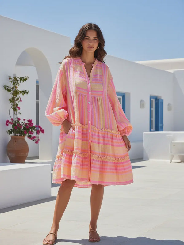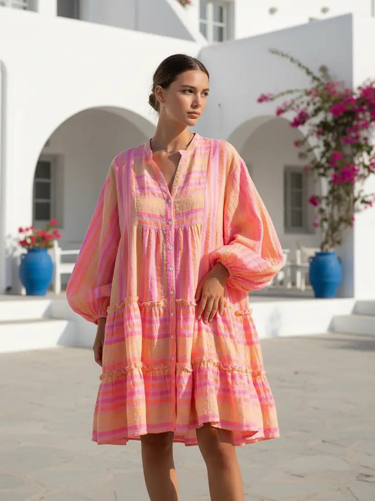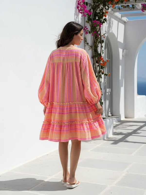 Effortless summer style meets all day comfort in this lightweight cotton muslin dress. Designed with a relaxed long sleeve shirt , this piece is perfect for warm weather, holidays, and easy everyday dressing. Made from breathable cotton muslin, the fabric feels soft against the skin while allowing airflow on hot days. The fresh neon stripe pattern adds a sun-ready feel. 100% Cotton Muslin Collared neckline with front button fastening Full length sleeves with elasticated cuffs Oversized fit Twin side pockets This design is available in S/M 10-14 and L/XL 16-20 for maximum comfort. Model 1 is size AUS 10, wears our size S/M Measurements: S/M: Bust 128 cm, Length 106 cm L/XL: Bust 140 cm, Length 110 cm