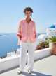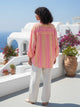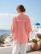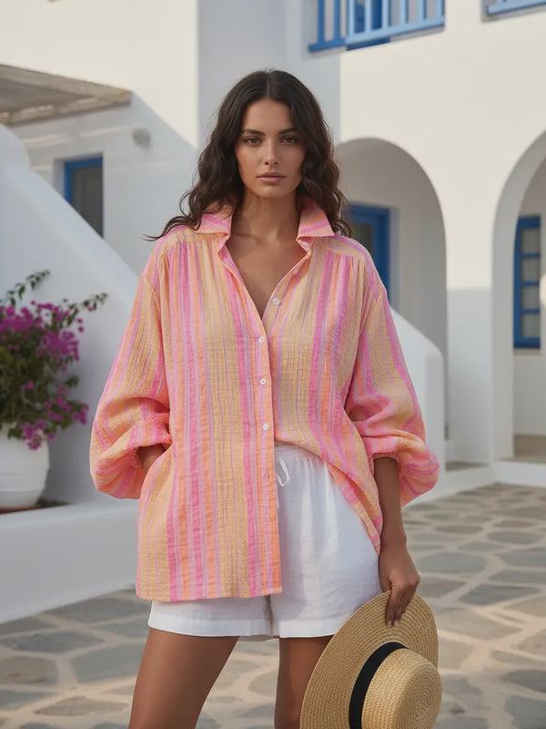Effortless summer style meets all day comfort in this lightweight cotton muslin shirt. Designed with a relaxed long sleeve shirt , this piece is perfect for warm weather, holidays, and easy everyday dressing. Made from breathable cotton muslin, the fabric feels soft against the skin while allowing airflow on hot days. The fresh neon stripe pattern adds a sun-ready feel. 100% Cotton Muslin Collared neckline with front button fastening Full length sleeves with elasticated cuffs Oversized fit High-low hems This One Size fits most is designed to fit a size AUS 10 to 20 comfortably Model is 5’8, size AUS 12, wears our one size