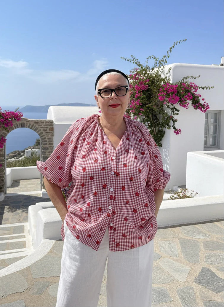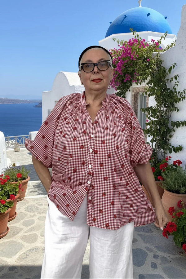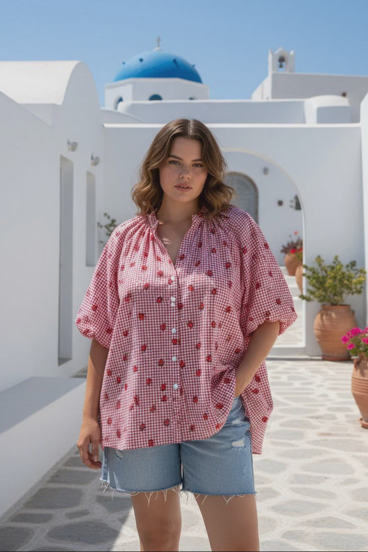 Enjoy easy, breezy weekend look with our new playful shirt. Crafted from a soft cotton blend fabric, it features a classic gingham check with a delightful strawberry print. Designed with a relaxed silhouette, button down front, and mandarin neckline, it offers both comfort and style for everyday wear.