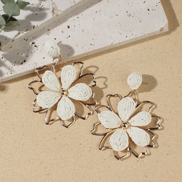 The Noosa Earrings feature natural rattan flowers with elegant gold details, creating a beautiful accessory that’s as comfortable as it is stylish.