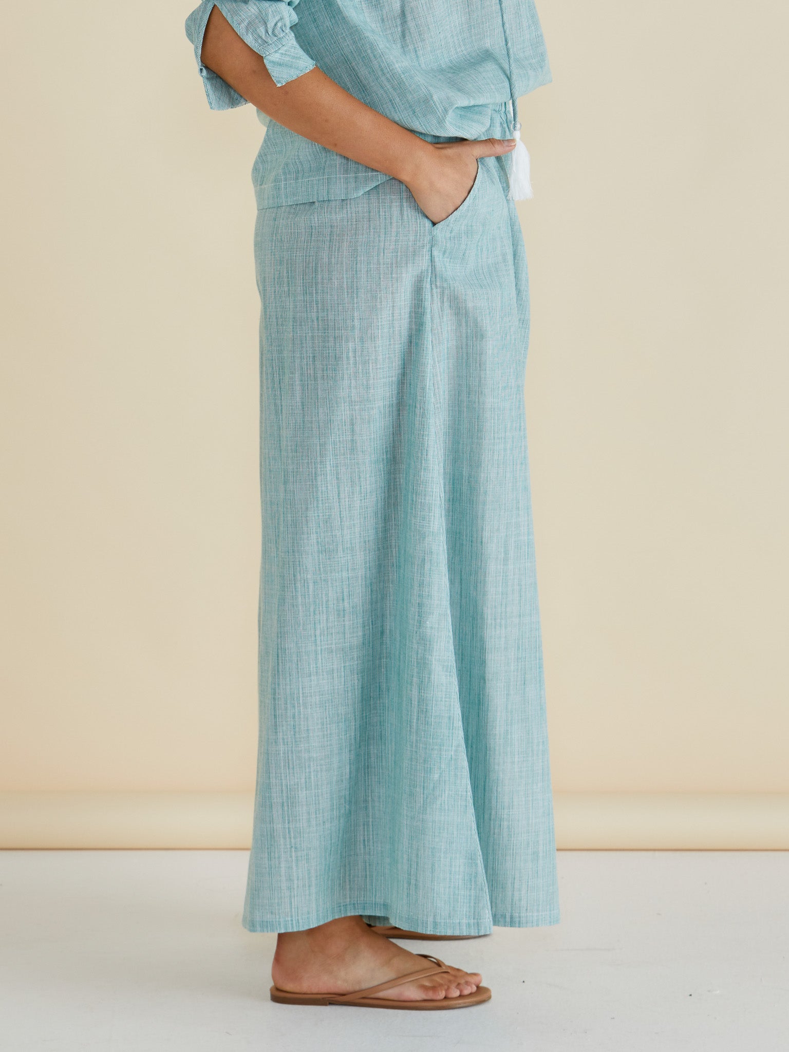 The Tatum Wide Leg Pant features handwoven cotton fabric with an elasticated waistband and wide palazzo leg. Practical pockets and mid-high rise create an elevated, comfortable silhouette. A classic, easy-to-wear pant ideal for transeasonal wardrobes.